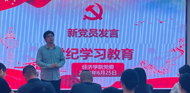 在这里,学院党委书记郭晋南为全体党员讲授了一堂生动的党课。郭书记以典型违纪案例警示教育开篇,警醒各位党员以身作则,坚守初心,时刻保持警惕。他强调,党员同志必须积极学习党的先进思想,才能确保我们党始终走在时代前列,始终成为全国人民的主心骨,始终成为坚强的领导核心。他结合党的历史、党的理论和党的实践,深入浅出地阐述了党的纪律和规矩的重要性,以及作为党员应该具备的责任和使命。随后,新党员代表、经济学教研室夏宇同志做了发言。他说,作为一名新党员,一定要加强党的理论学习,以优秀党员的标准要求自己,坚持不懈,不忘初心,知行合一,平凡踏实,努力践行为人民服务的宗旨!