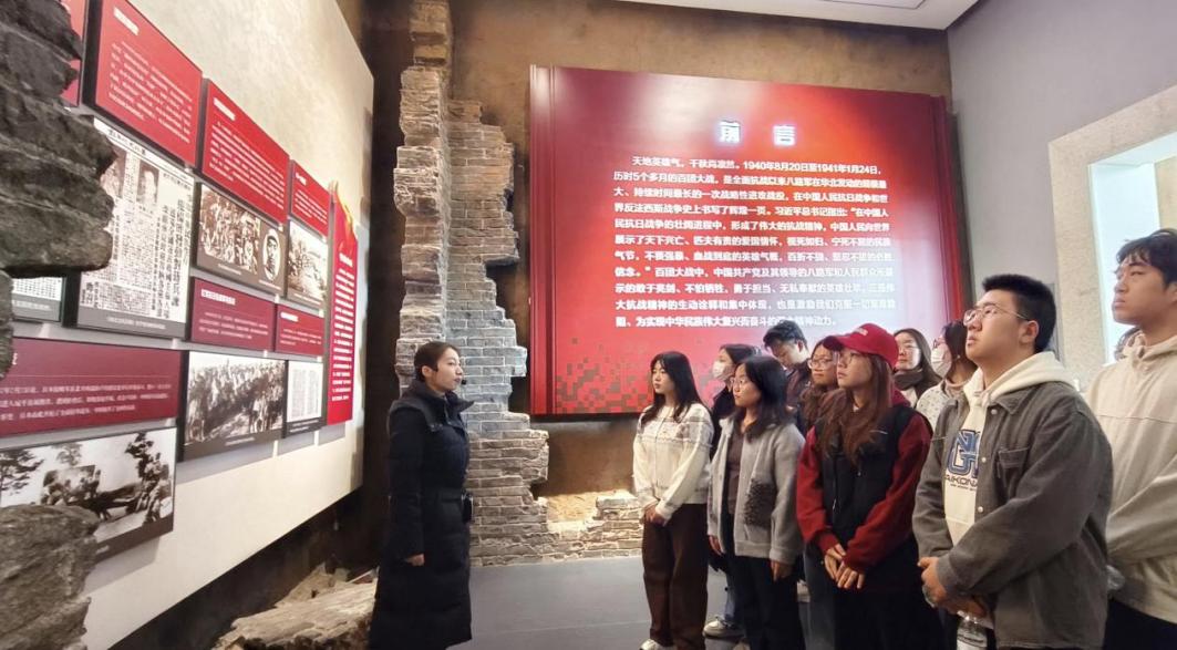 上午9时,队伍抵达首站——百团大战纪念馆。该馆位于狮脑山上,是百团大战重要作战区域之一。馆内陈列800余件历史文物、300余幅珍贵照片以及十余处场景复原展陈,系统呈现了1940年八路军在华北地区发动大规模破袭战的历史脉络。讲解员重点介绍了“狮脑山阻击战”“正太铁路破袭战”等关键战役,师生认真聆听,细致观摩参战部队序列图、作战地图及相关实物展品,深入了解百团大战的战略部署与历史意义,感悟这份用热血铸就的伟大抗战精神的强大力量。
